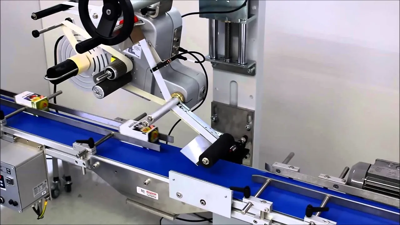 When the barrier is reached, an application trigger is tripped. The label applicator applies a label on the product in Wipe On procedure. The label on the top side is pushed on to the product by a brush or roller. After labelling, the products move on and can be removed from the conveyor by the customer.